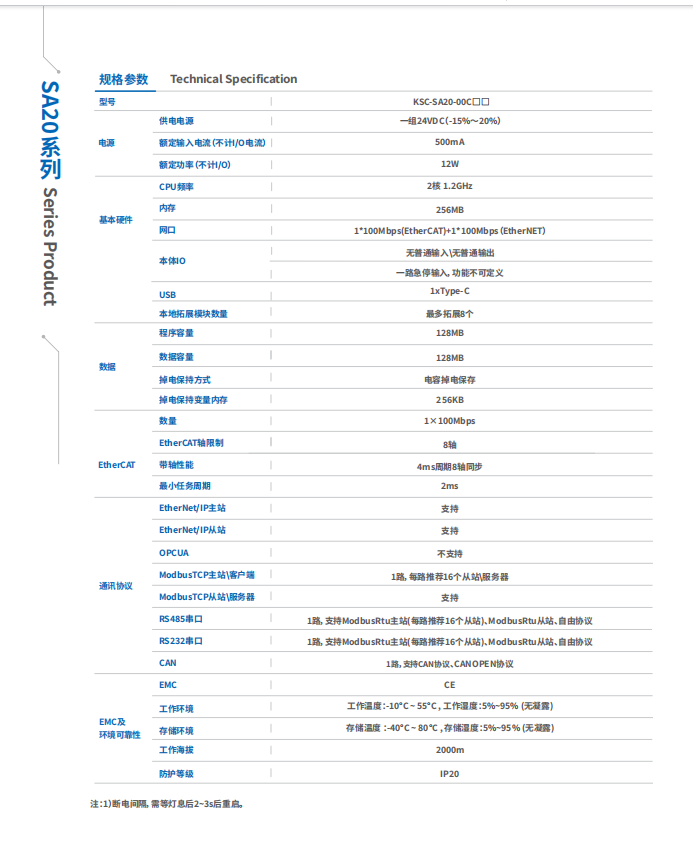 KSC-SA20 控制器符合 IEC61131-3 編程規(guī)范,支持 PLCopen 標準的 6 種編程語言。內(nèi)部集成了 USB、RS485、 以太網(wǎng)、CAN 等常用工業(yè)控制接口。KSC-SA20 控制器支持 EtherCAT、MODBUS-TCP、CANopen、EtherNet/IP、 RS485 等進行遠程機架擴展。